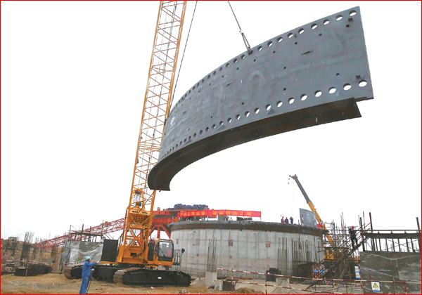山鋼集團日照鋼鐵精品基地1號5100m3高爐工程第一塊爐殼日前安裝就位,目前工程正按照1號高爐本體今年建成的目標推進。圖為施工現場。...